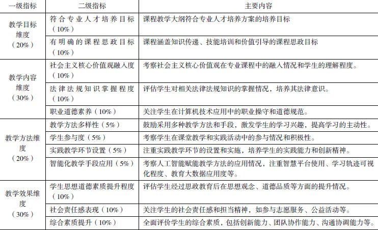 构建科学的课程思政指标体系,既是落实《高等学校课程思政建设指导纲要》的关键举措,也是解决当前专业教育和思政教育 “两张皮” 现象的有效途径。本文提出的创新性指标体系框架,可为新工科背景下计算机类专业课程思政建设提供理论支持与实践参考。