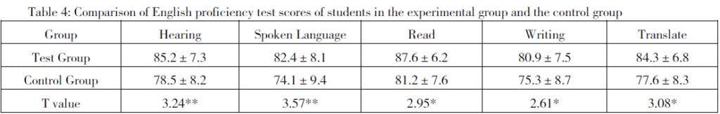This study adopts the experimental research method, takes the college English course of a certain university as the research object, and randomly selects two teaching classes as the experimental group and the control group. The experimental group adopted an innovative teaching model based on artificial intelligence and mobile Internet, while the control group adopted a traditional teaching model. Before and after the experiment, English proficiency tests and questionnaire surveys were conducted on the two groups of students to collect students’ learning effect data and feedback. At the same time, through teacher interviews, classroom observations, etc., we can understand the implementation process and effects of innovative teaching models. SPSS software was used to conduct statistical analysis on the collected data to test the effectiveness of the innovative teaching model. The measurement tools used in the study include English proficiency test questions, learning experience scale, learning investment scale, etc. to ensure the reliability and validity of the research.