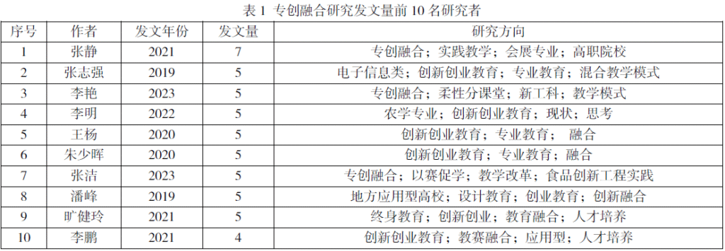 第一,自 2014 年《国务院关于加快发展现代职业教育的决定》首次提出“产教融合”以来,在创新驱动发展战略的牵引下,学术界对“专创融合”展开了持续而集中的研究探索。目前,该领域已形成以张静、张志强等为代表的核心作者群,以及咸阳职业技术学院、武汉软件工程职业学院等高产机构;随着政策节拍逐年加密,文献数量呈爆发式增长,学科视野亦“由窄及宽”,专创融合已成为教育学、管理学、工程学等多学科共同关注与交叉研究的热点议题。