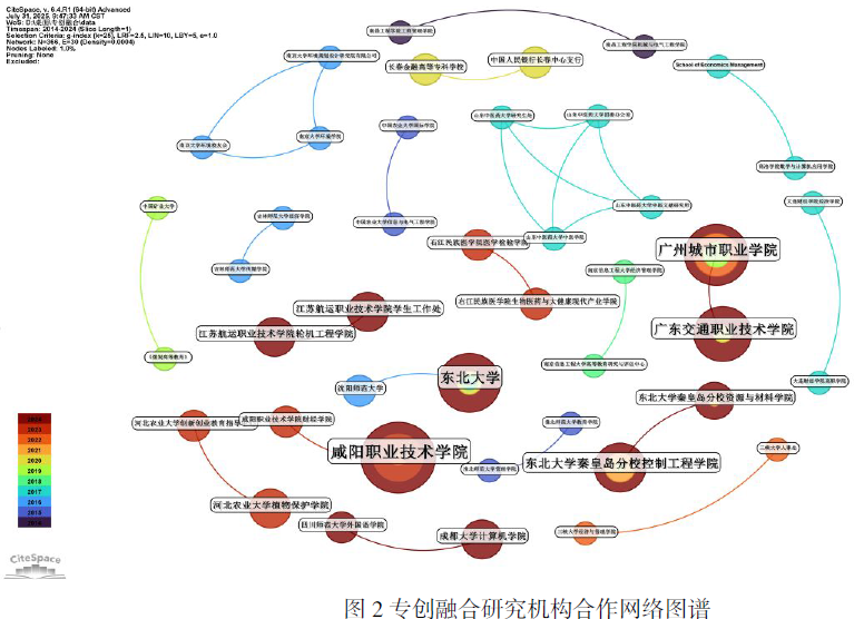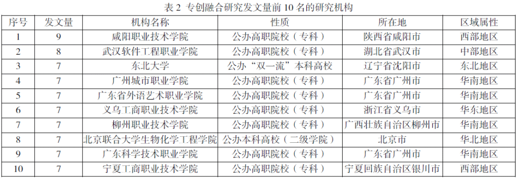 从地理位置看,从排名前 10 的发文量最多的研究机构看,华东地区和华中地区并列占比最高,各有 3 所高校,合计占 60%。这与华东与华中地区长期是我国教育学研究的高地,拥有多所教育学“第一梯队”高校。这些高校不仅发文量大,而且在专创融合的理论建构、课程开发和师资培训方面起步早、积累深。华东(上海、江苏、浙江)和华中(湖北、湖南)地区地方财政教育投入高、高校办学自主权大,为专创融合的落地提供了制度与资金保障。从区域属性看,华南地区(广州城市职业学院、广东省外语艺术职业学院、广东科学技术职业学院、柳州职业技术学院)以 4 所高校在样本中占比最高,“华南板块”独占鳌头,这与粤港澳大湾区“职教高地”的长期定位直接呼应。2023 年广东省高职经费规模全国领先。西部地区(咸阳职业技术学院、宁夏工商职业技术学院)虽仅占 2 席,却呈现出“政策洼地中的单点突破”特征:两地均为教育部“西部高职改革发展试点” 省份,借助东西部协作资金与“双高计划”西部倾斜政策,实现了专创融合研究的“弯道超车”。华北(北京联合大学生物化学工程学院)与东北(东北大学)则体现出“双一流高校引领”的差异化路径:北京联合大学依托首都“高精尖产业”资源,以“生物医药+专创融合”为特色,形成“学科优势—产业需求—研究议题”的闭环;东北大学作为区域内唯一入选的本科层次高校,其研究聚焦专创融合的“理论纵深”,与高职院校“应用导向”形成互补,共同验证了不同办学层次在政策响应中的角色分野。