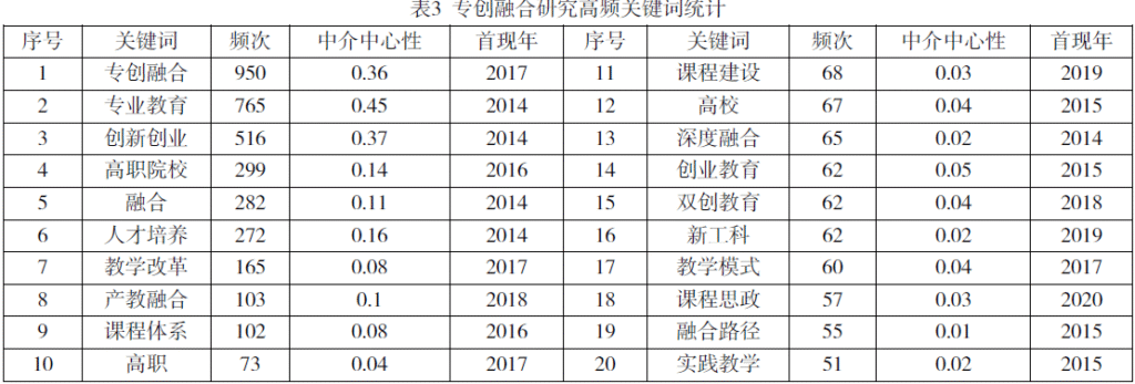 将频次排名前 20 关键词进行列举,可以看出“专创融合”出现的频次最高,为 950 次,其次是“专业教育”频次为 765 次,“创新创业”频次为 516,“高职院校”频次为299,“融合”频次为 282,“人才培养”频次为 272,“教学改革”频次为 165,“产教融合”频次为 103,“课程体系”频次为 102,“高职”频次为 73,其他高频关键词出现的频次都在 50 以上(见表 3 所示)。此外,相较于“课程建设”等同级别词汇而言,“专创融合”、“专业教育”、 “创新创业”、“高职院校”、“融合”及“人才培养”” 属于强势关键词,出现频次高达 270 次以上。根据 CiteSpace工具解说,相关节点的中介中心性大于 0.1 的节点则被称作关键节点。“专创融合”、“专业教育”及“创新创业”等属于专创融合研究领域的关键节点,关键节点恰好对应政策文本中的固定表述(如“专创融合”“创新创业”),显示学术话语与政策话语高度耦合,研究热点受政策驱动且反哺政策落地,形成“政策-研究”闭环。这些专创融合高频关键词经归纳可分为四类。第一类是政策导向类,指 的是所依据的宏观政策,包括“专创融合”、“产教融合”、“双创教育”、“新工科”、“课程思政”这几个关键词。例如第二类是教学层级类,指的是专创融合实施的主题。包括“高职院校”、“高职”、“高校”这几个关键词。第三类是目标要素类,指的是研究的核心对象。包括“专业教育”、“创新创业”、“人才培养”、“创业教育”这几个关键词。第四类是实践路径类,指的是研究的落地载体。包括“融合”、 “深度融合”、“教学改革”、“课程体系”、“课程建设”、 “教学模式”、“融合路径”、“实践教学”这几个关键词。