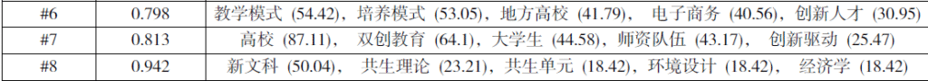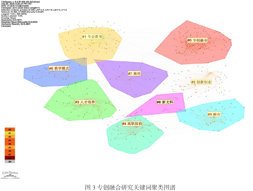 借助关键词聚类图谱,可直观呈现研究热点及其聚焦强度。该方法通过聚类统计,将原本错综的关键词共现网络压缩为少量主题簇,核心算法选用对数似然率(LLR)完成聚类(如图 3 所示)。专创融合研究关键词聚类图谱的模块值为 Q 值为 0.3673,大于 0.3,说明聚类结构显著;平均轮廓值 S 值为 0.6954,大于 0.5,说明聚类结果是显著且合理的。图谱中展现了“#0 专创融合”“#1 专业教育”“#2 创新创业”“#3 人才培养”“#4 高职院校”“#5 融合”“#6 教学模式”“#7 高校”“#8 新文科”共 9 个聚类。反映出专创融合的研究文献主要围绕这 9 大关键词群组展开。另外,在聚类分析的基础上,进一步导出关键词聚类表(见表 4 所示)。