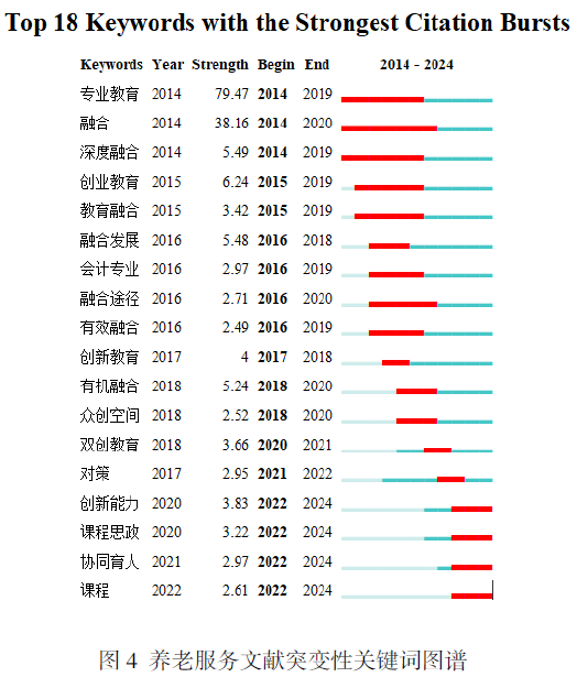 作为某一时段内被引频次急剧增加的关键词汇,突现词能够被用来展现一个领域中学界的研究趋势变化。突变词突然出现的程度越高,表明该关键词的学术关注度越突出。因此,通过追踪突变词的变化,能够较好地发现该研究领域主题在不同时段的变化趋势。因此,本文通过绘制出突变率前18 位的关键词图谱(见图 4 所示)。图中红色加粗部分 为关键词突变的时间段,在图谱中“Begin”“End”列可知关键词突变的起始和终止具体年份。通过分析突变词图谱发现,可将 2014-2024 年专创融合研究划分为四个明显阶段,各阶段呈现出“概念萌芽—融合扩散—双创深化—课程思政协同”的演进脉络: