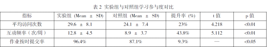 表 2 展示了实验组与对照组在平台访问次数、互动频率及作业提交率方面的表现。