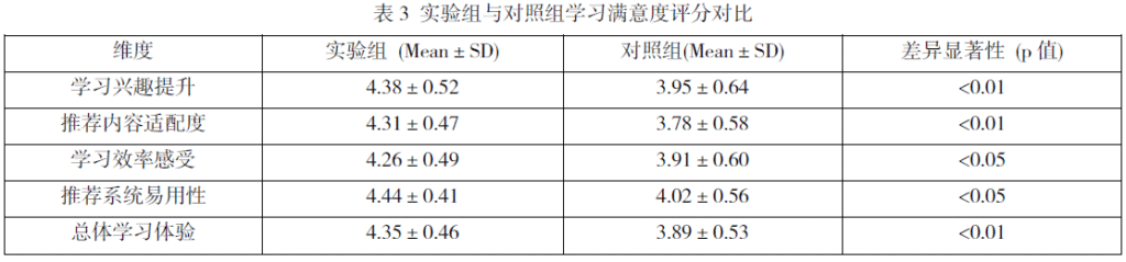 调查结果表明,实验组学生在所有维度上的满意度均显著高于对照组,其中“推荐内容适配度”和“总体学习体验” 的差异最为突出。